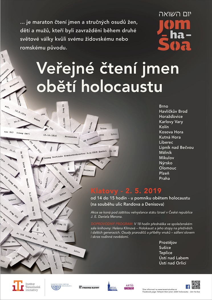 Zveme Vás na vzpomínkovou akci Jom ha-šoa 2019 - Veřejné čtení jmen obětí holocaustu, která se v Klatovech bude konat třetím rokem.